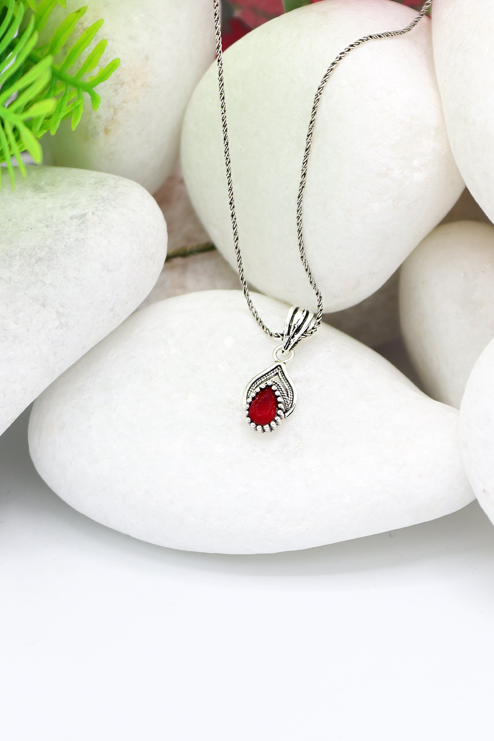 "Drop Model Authentic Filigree Silver Necklace With Ruby Gemstone"