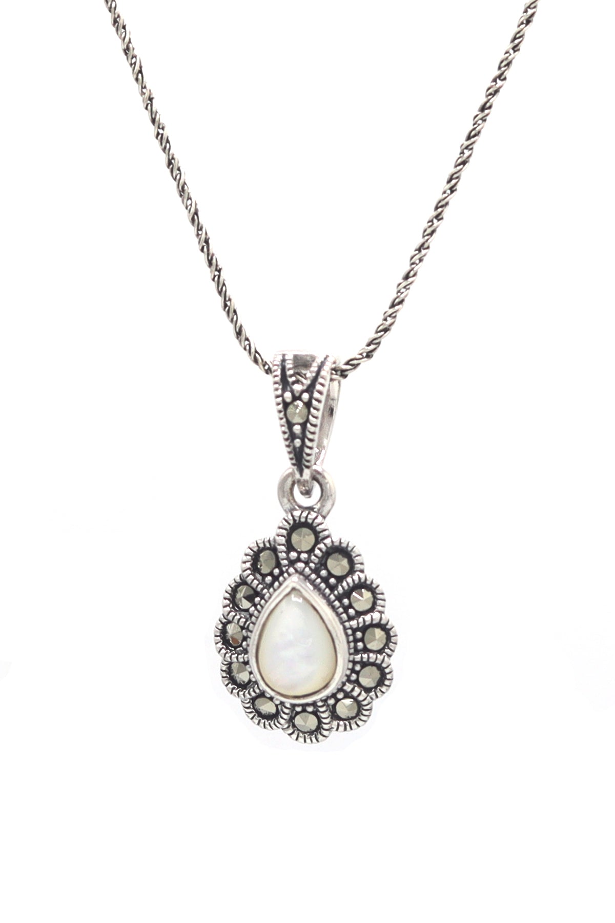 "Drop Model Authentic Silver Necklace With Mother of Pearl and Marcasite Gemstone"